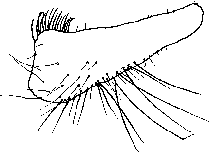 Innenwinkel, der deutlich größer als 90° ist (Abb. 5). Gesicht in Höhe der Fühlerbasis etwas schmäler als ein Auge in gleicher Höhe, der Augenwinkel beträgt daher etwa 90°.  | Surstylus